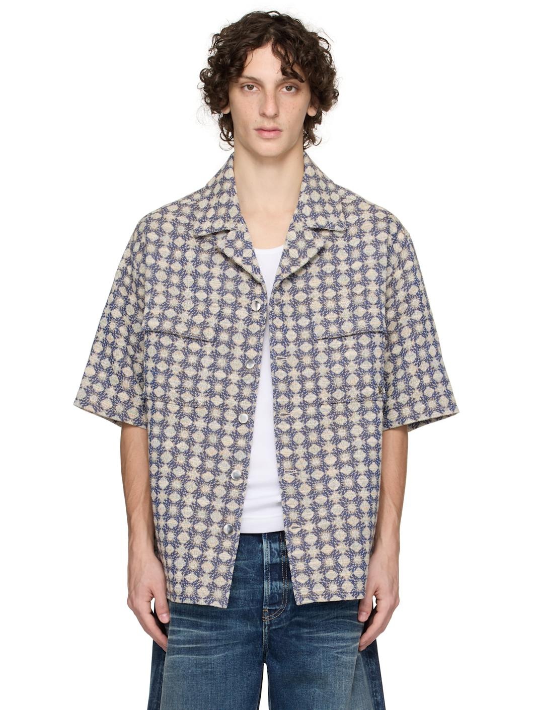 Cotton-blend boucle shirt. Jacquard logo pattern throughout. · Open spread collar · Button closure · Flap pockets · Logo hardware at chest · Logo patch at back collar · Full viscose satin lining Supplier color: Midnight blue Body: 40% cotton, 27% polyester, 24% wool, 9% polyamide. Lining: 100% viscose. Made in Italy 252886M192024