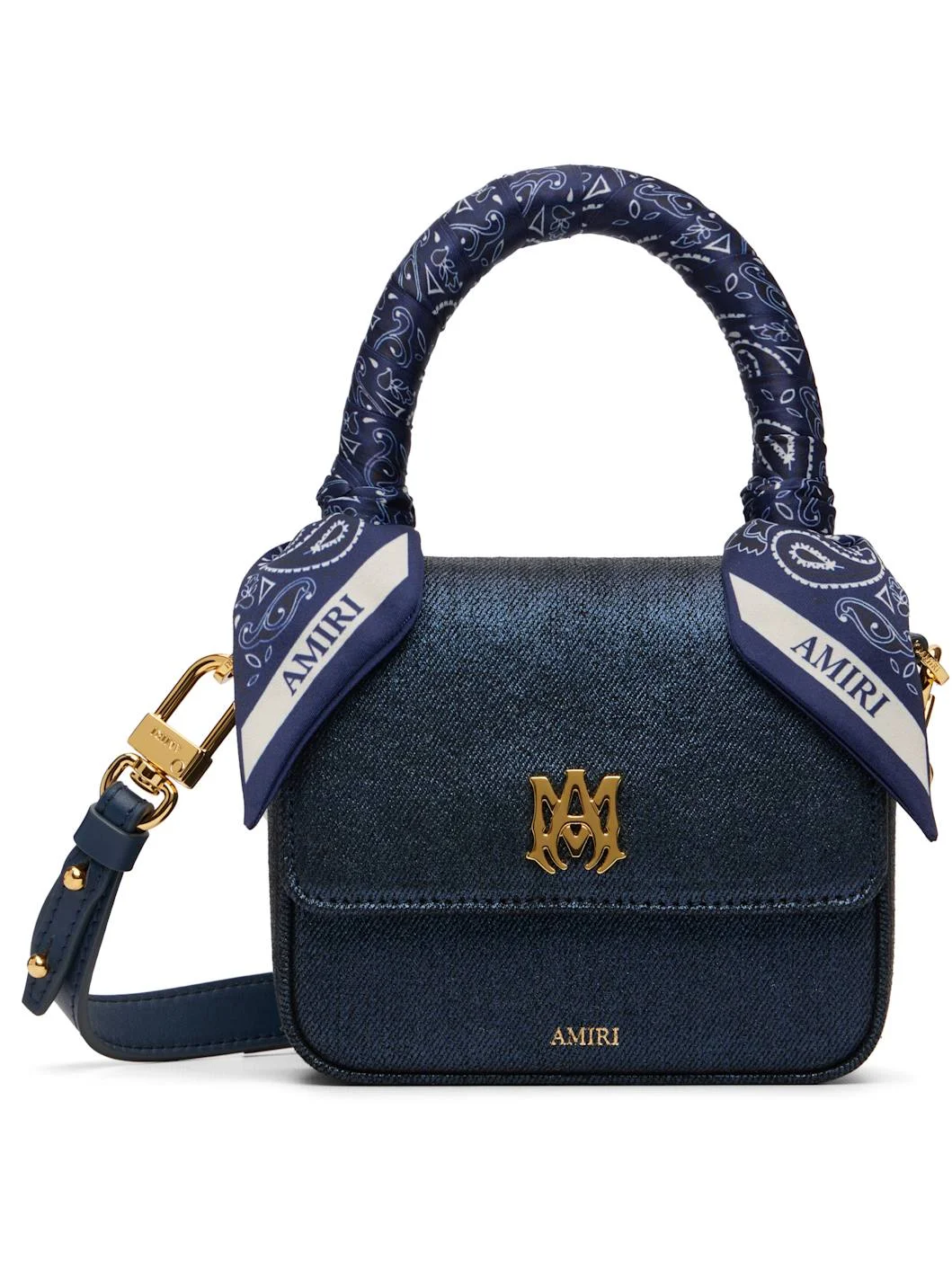 Non-stretch waxed denim top handle bag. · Bandana-style satin trim at carry handle · Leather adjustable and detachable crossbody strap · Logo hardware and concealed patch pocket at face · Logo stamp at face and back · Magnetic flap closure · Zip pocket at interior · Gold-tone hardware · H5" x W6" x D2.5" · Total height: H9" Supplier color: Wet shimmer Textile, leather. Made in Italy 252886F046011
