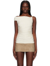 Stretch viscose jersey top. Ruching throughout. · Asymmetrical off-the-shoulder construction · Logo hardware at shoulder strap · Full stretch jersey lining Supplier color: Alabaster Body: 96% viscose, 4% elastane. Lining: 75% polyamide, 25% elastane. Made in Italy 251886F111005