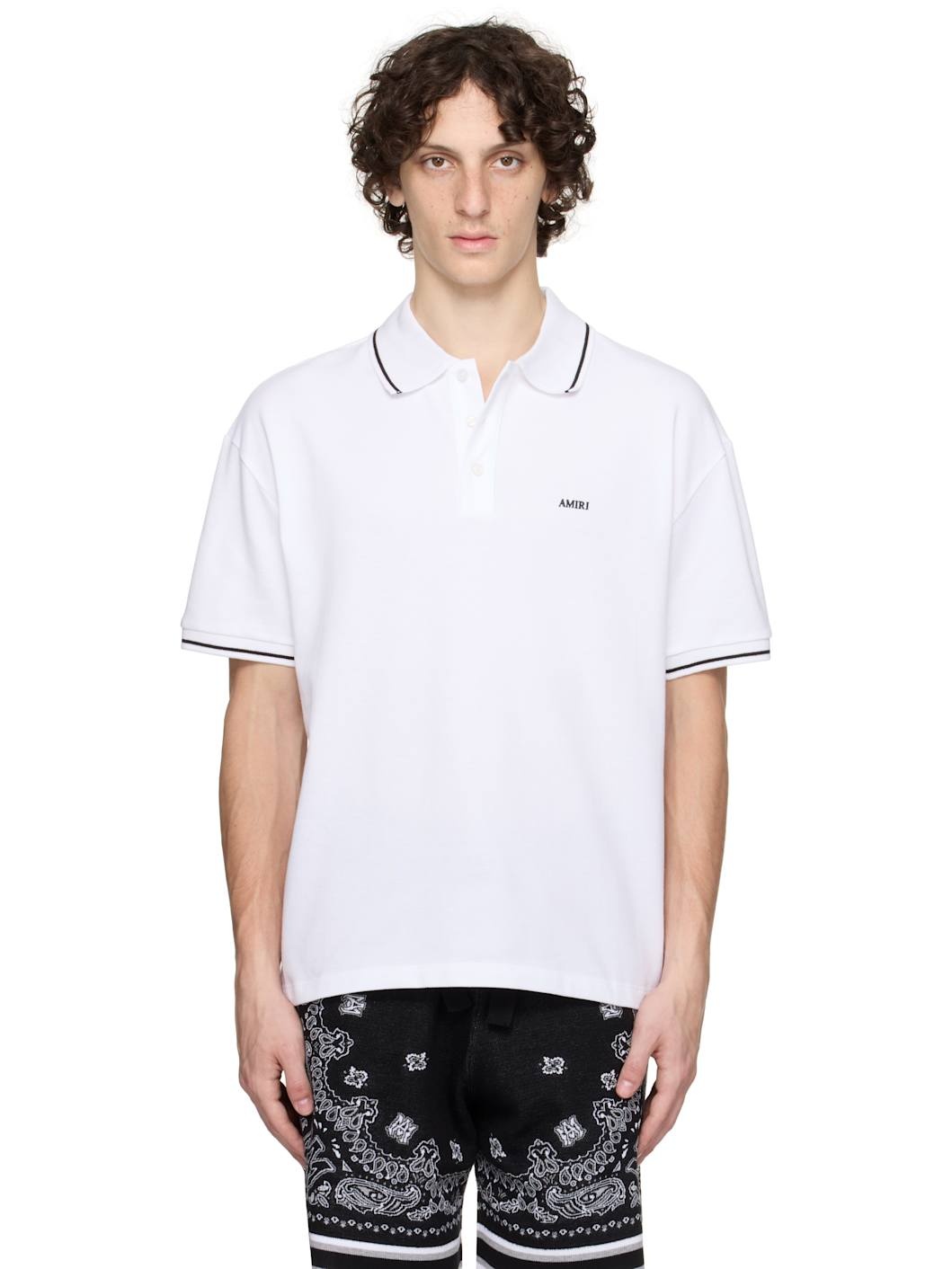 Cotton pique polo. · Striped rib-knit spread collar and cuffs · Three-button placket · Logo embroidered at chest · Tennis-tail hem · Dropped shoulders Supplier color: White 100% cotton. Made in Italy 252886M212003