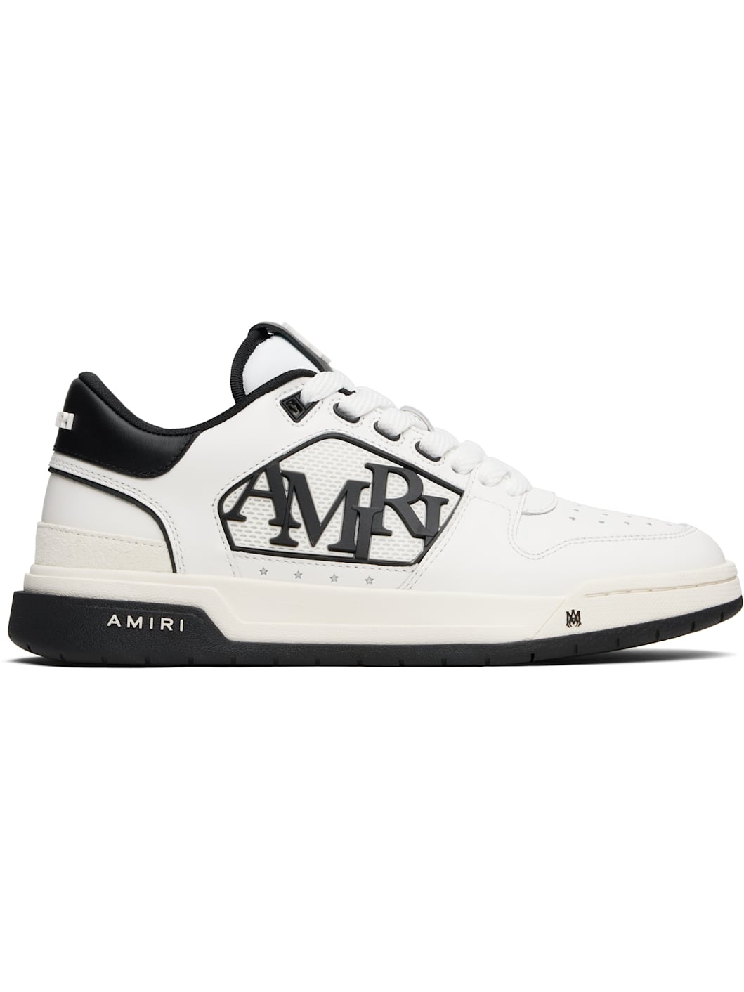Low-top buffed leather sneakers. · Graphic perforations at toe and sides · Lace-up closure · Logo patch at padded tongue · Padded collar · Rubberized logo applique at sides · Logo bonded at heel tab · Mesh lining · Logo embossed at textured rubber midsole · Treaded rubber sole Supplier color: White/Black Upper: leather. Sole: rubber. Made in Viet Nam 252886M237051