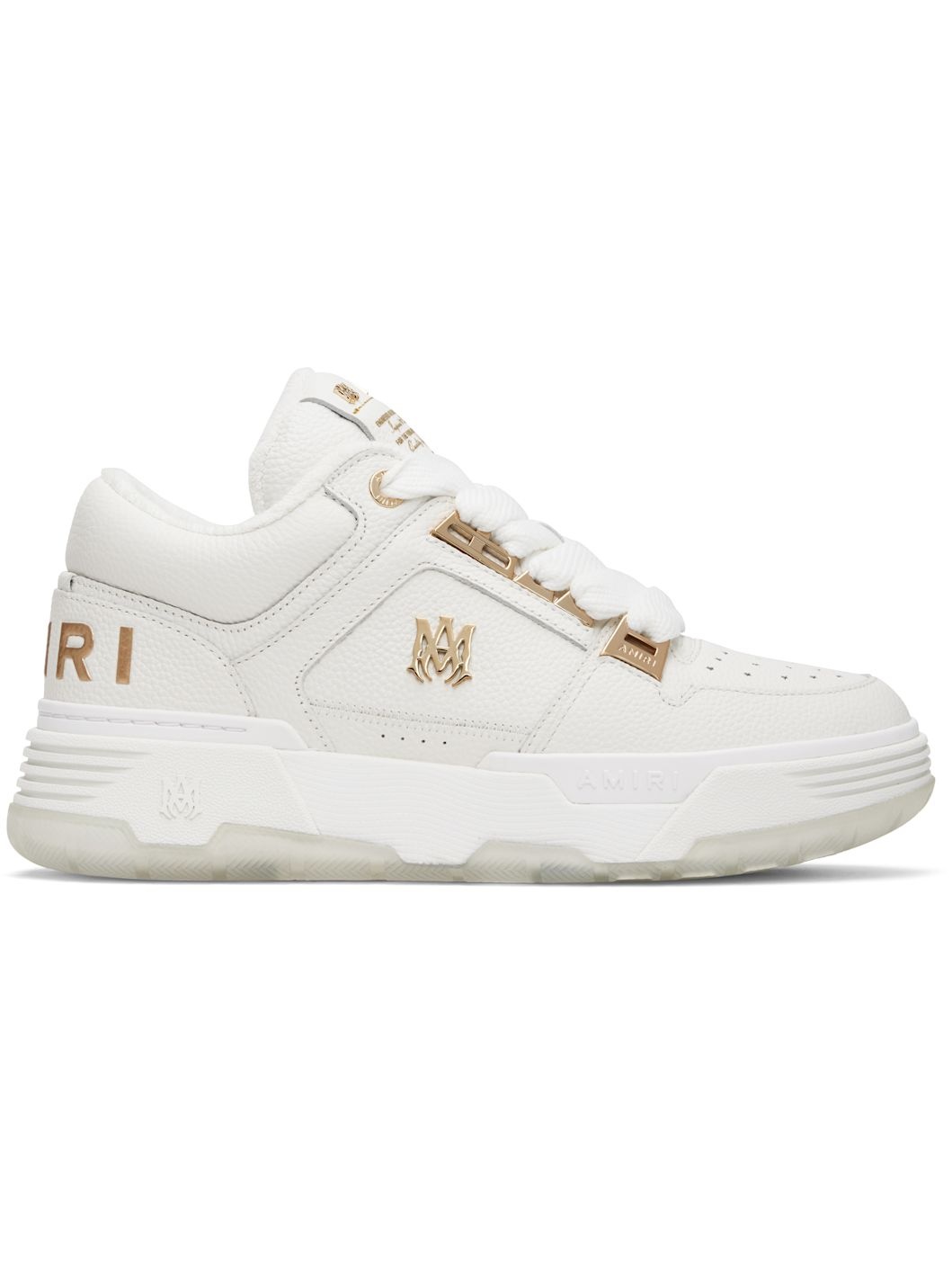 Mid-top grained leather sneakers. · Perforations at toe · Lace-up closure · Logo patch at tongue · Padded tongue and collar · Logo hardware at outer side · Logo embossed at heel counter · Textured rubber midsole · Treaded rubber sole · Gold-tone hardware Supplier color: White Upper: leather. Sole: rubber. Made in Viet Nam 252886M237010