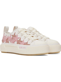 Low-top paneled buffed leather and canvas sneakers in white and pink. · Rubber cap toe · Lace-up closure · Logo-embossed tongue · Pull-loop at heel collar · Signature graphic appliques at sides · Buffed leather lining · Logo-embossed textured rubber midsole · Treaded rubber sole Supplier color: White/Pink Upper: leather, textile. Sole: rubber. Made in Viet Nam 251886F128004