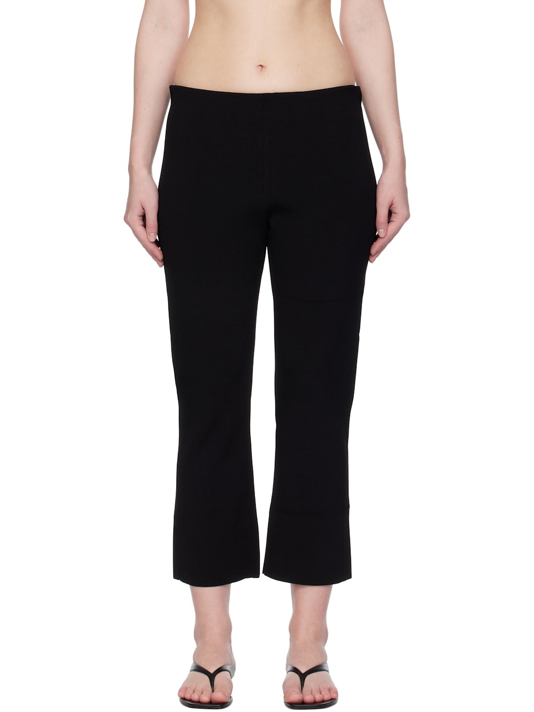 Ribbed rayon-blend crepe capri leggings. · Elasticized waistband · Pointelle-knit stripe detailing at back waist Supplier color: Black 83% rayon, 17% polyester. Made in South Korea 251436F087014