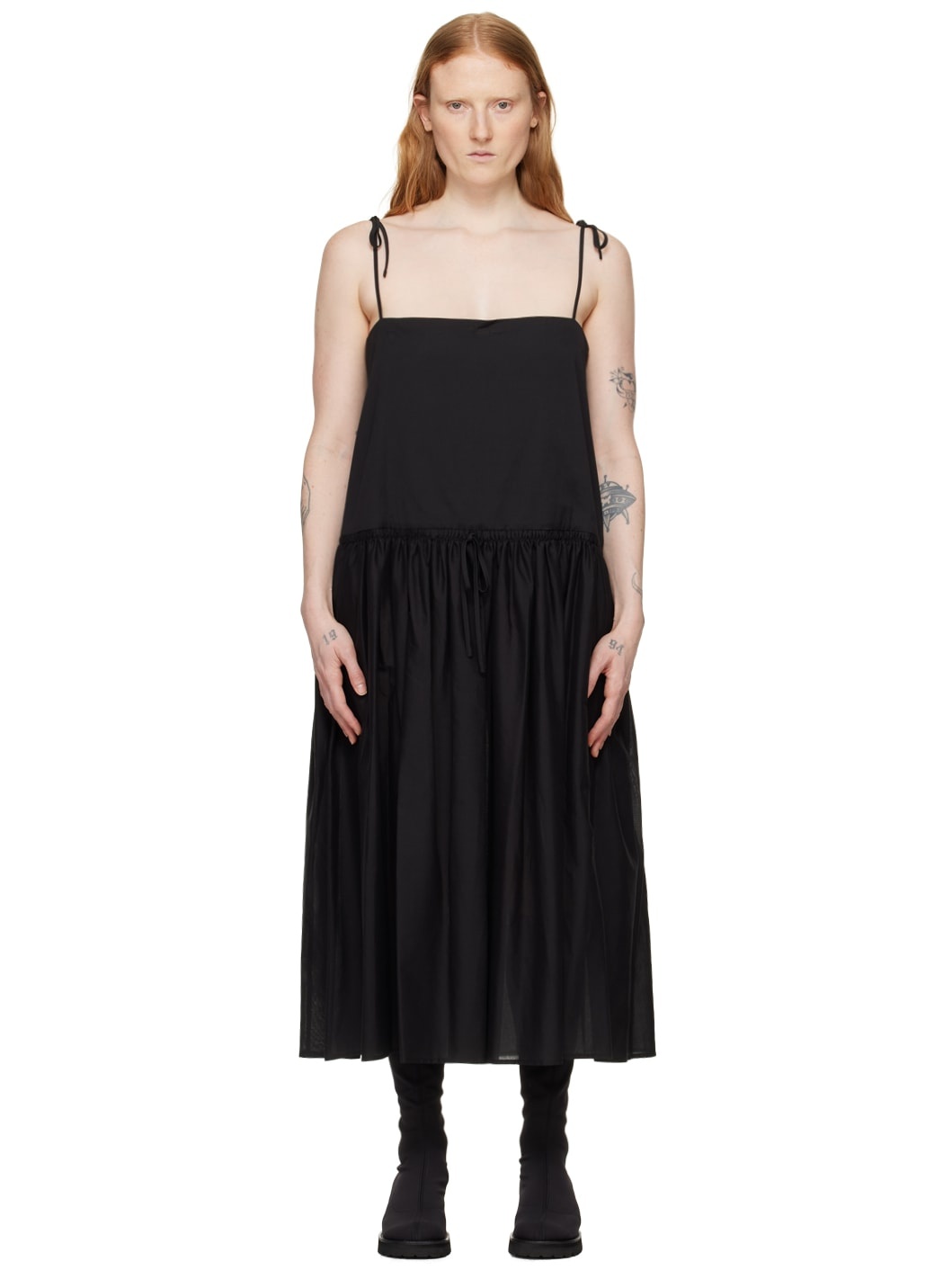Semi-sheer cotton broadcloth dress. Shirring throughout. · Square neck · Drawstring and pleats at waist · Seam pockets · Concealed zip closure at side seam · Self-tie spaghetti straps · Partial broadcloth lining Supplier color: Black 100% cotton. Made in South Korea 242436F054000