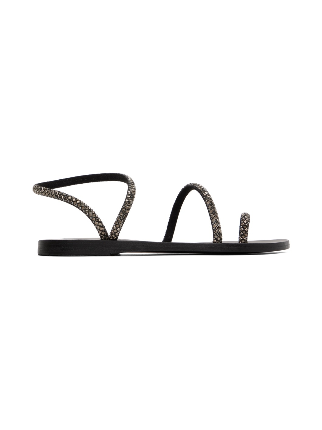 Handcrafted leather slip-on sandals in black. Crystal-cut detailing throughout. · Single toe strap · Fixed straps at vamp and ankle · Logo embossed at footbed · Leather sole with rubber injection Supplier color: Black Upper: leather. Sole: leather, rubber. Made in Greece 231674F124101