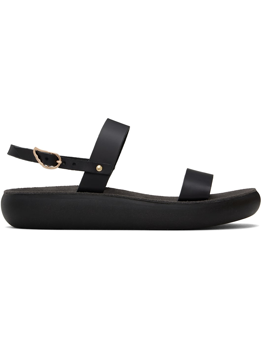 Handcrafted chemical-free buffed leather flat sandals in black. · Raw edges throughout · Open toe · Pin-buckle ankle strap · Logo embossed at padded suede footbed · Logo-embossed rubber sole Supplier color: Black Upper: leather. Sole: rubber. Made in Greece 251674F124044