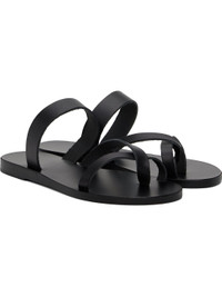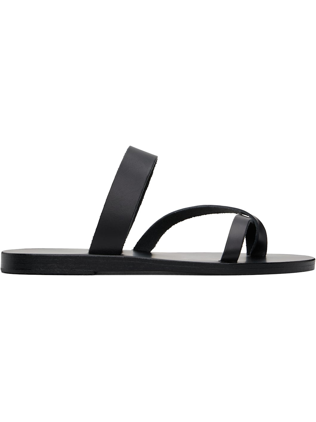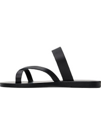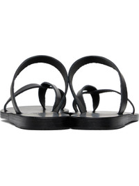 Handcrafted chemical-free buffed leather flat sandals in black. · Raw edges throughout · Open toe · Fixed criss-crossing toe strap · Logo embossed at leather footbed · Textured rubber heel · Leather sole Supplier color: Black Upper: leather. Sole: leather, rubber. Made in Greece 251674F124043