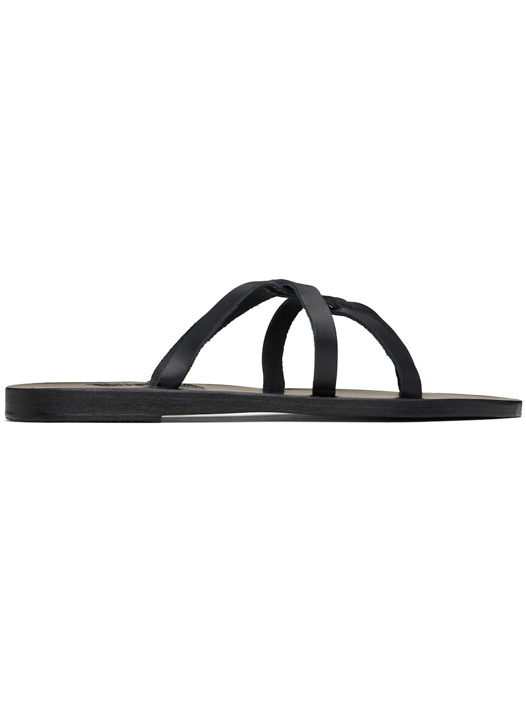 Handcrafted chemical-free buffed leather flat sandals in black. · Open toe · Sliding crisscrossing straps at vamp · Logo embossed at footbed · Stacked leather sole with rubber injection Supplier color: Black Upper: leather. Sole: leather, rubber. Made in Greece 251674F124069