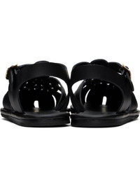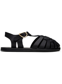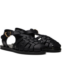 Handcrafted chemical-free buffed leather flat sandals in black. · Cutouts throughout · Braided detailing at vamp · Pin-buckle ankle strap · Logo embossed at padded footbed · Leather midsole · Treaded rubber sole Supplier color: Black Upper: leather. Sole: rubber. Made in Greece 251674F124062