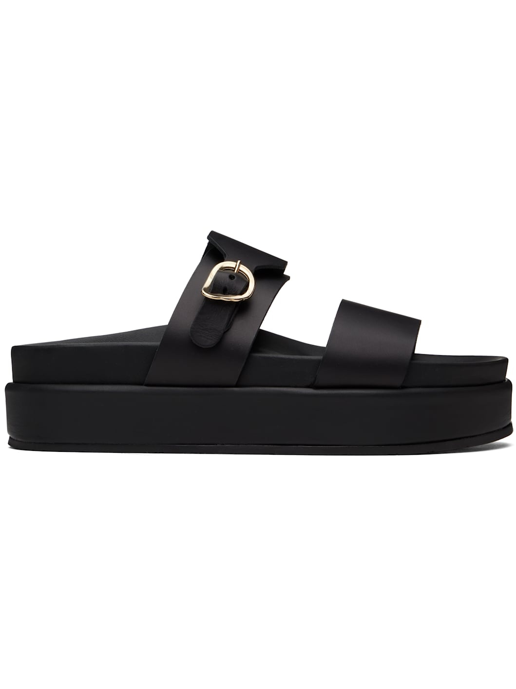 Handcrafted chemical-free buffed leather flat sandals in black. · Open toe · Pin-buckle strap at vamp · Logo embossed at molded footbed · Treaded rubber platform sole · Platform: H1.75" Supplier color: Black Upper: leather. Sole: rubber. Made in Greece 251674F124056