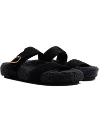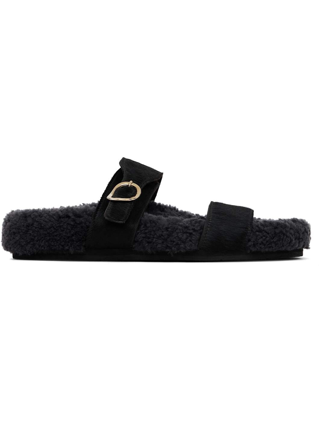 Handcrafted pony hair on leather flat sandals in black. · Open toe · Pin-buckle strap at vamp · Molded shearling lined footbed · Logo treaded rubber sole Supplier color: Black Upper: leather, sheepskin. Sole: rubber. Made in Greece 251674F124004