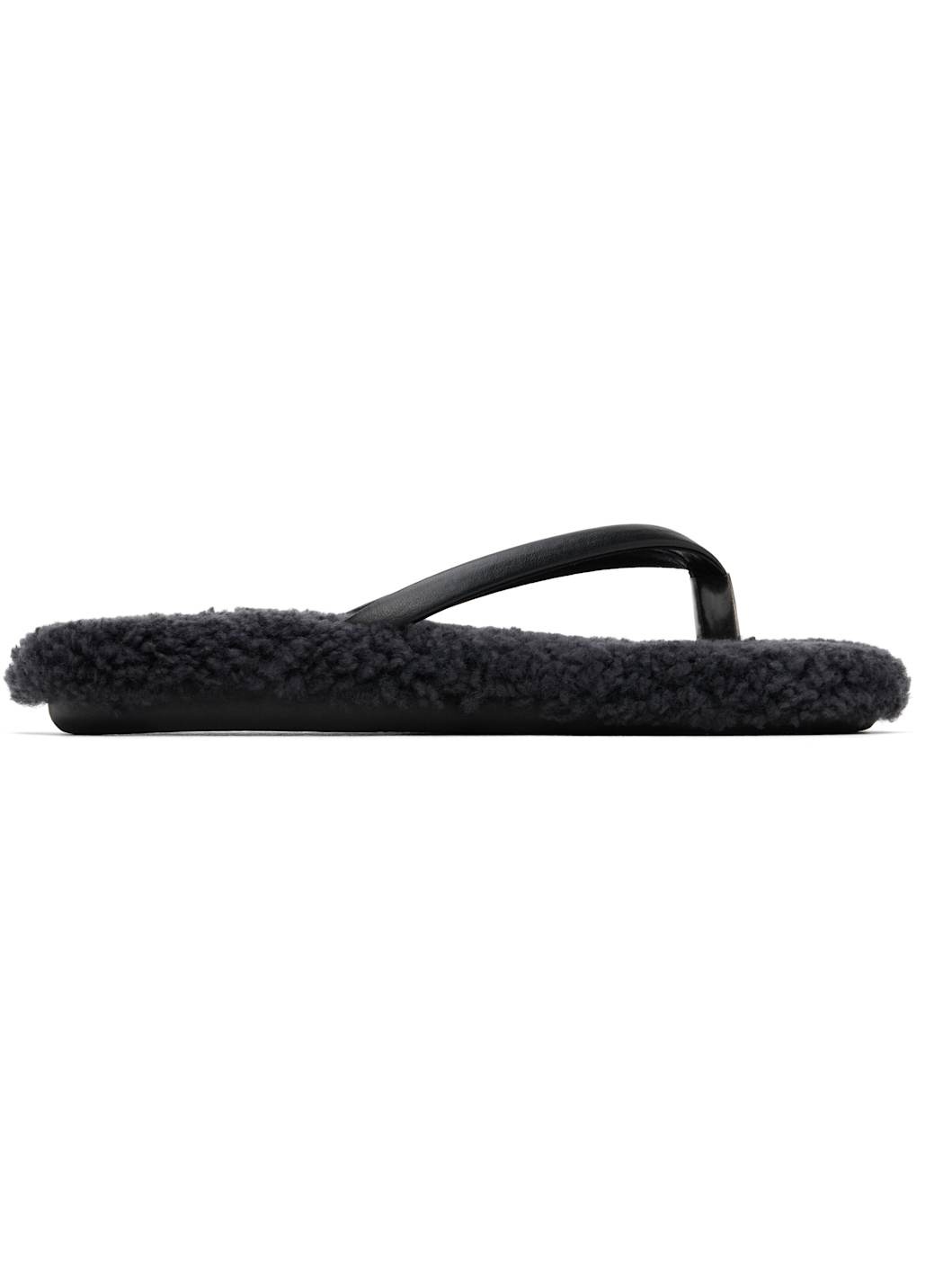 Handcrafted nappa leather flip-flops in black. · Open toe · Thong-style strap at vamp · Shearling-lined footbed · Logo-treaded rubber sole Supplier color: Black/Black shearling Upper: leather, sheepskin. Sole: rubber. Made in Greece 251674F124010