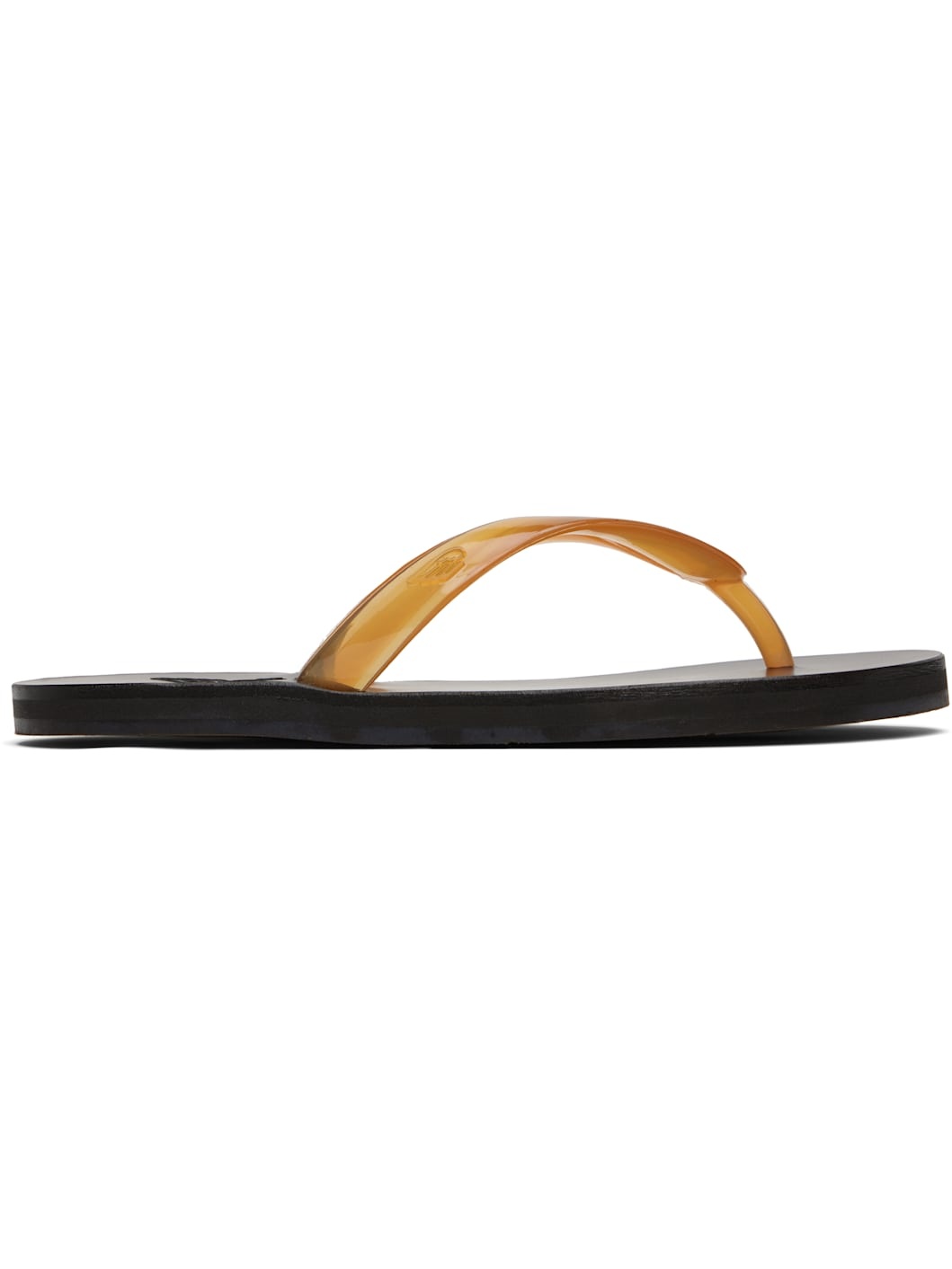 Handcrafted semi-transparent vinyl flip-flops. · Logo-embossed thong-style strap · Vegetable-tanned buffed leather footbed · Hand-stitched stacked leather midsole · Logo-embossed rubber sole Supplier color: Clear caramel Upper: polyvinyl chloride. Sole: leather, rubber. Made in Greece 252674F124010