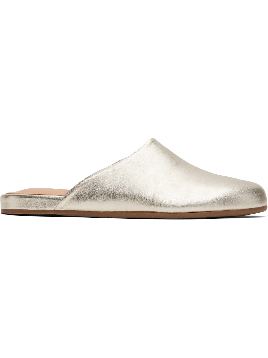 Handcrafted buffed nappa leather mules in metallic gold tone. · Logo-embossed padded leather footbed · Grained calfskin lining · Logo-treaded rubber sole Supplier color: Platinum Upper: leather. Sole: rubber. Made in Greece 251674F121011