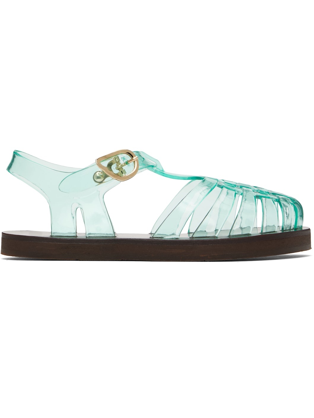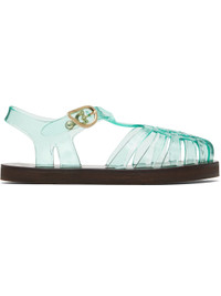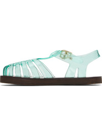 Handcrafted transparent vinyl flat sandals in green. · Cutouts throughout · Logo hardware at pin-buckle ankle strap · Hand-stitched stacked leather midsole · Logo-embossed rubber sole Supplier color: Clear aqua Upper: polyvinyl chloride. Sole: leather, rubber. Made in Greece 251674F124024