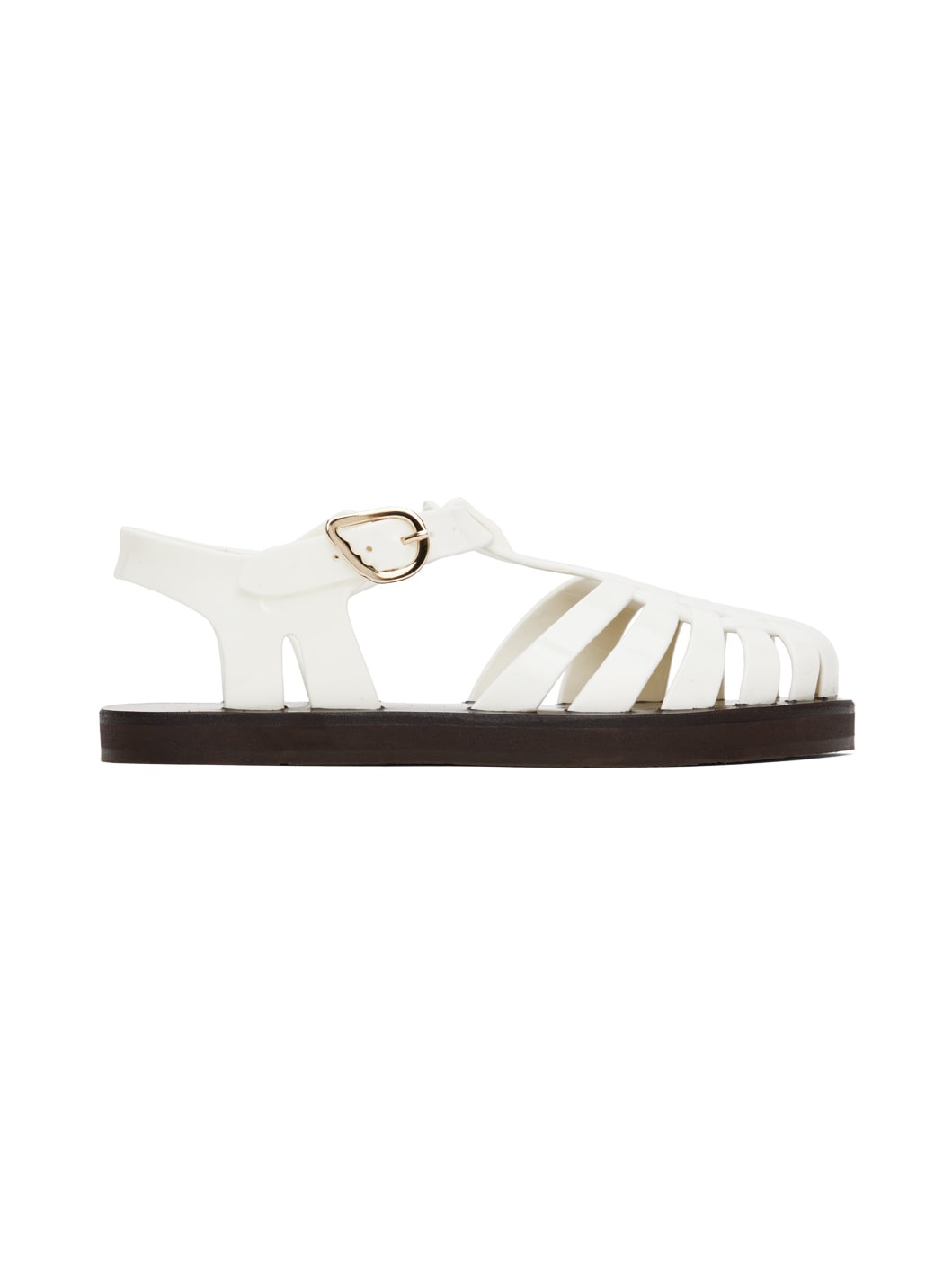 Handcrafted woven PVC sandals in white. · Cutouts throughout · Logo pin-buckle ankle strap · Logo embossed at leather footbed · Hand-stitched stacked leather midsole · Logo-embossed rubber sole Supplier color: White Upper: polyvinyl chloride. Sole: leather, rubber. Made in Greece 242674F124000