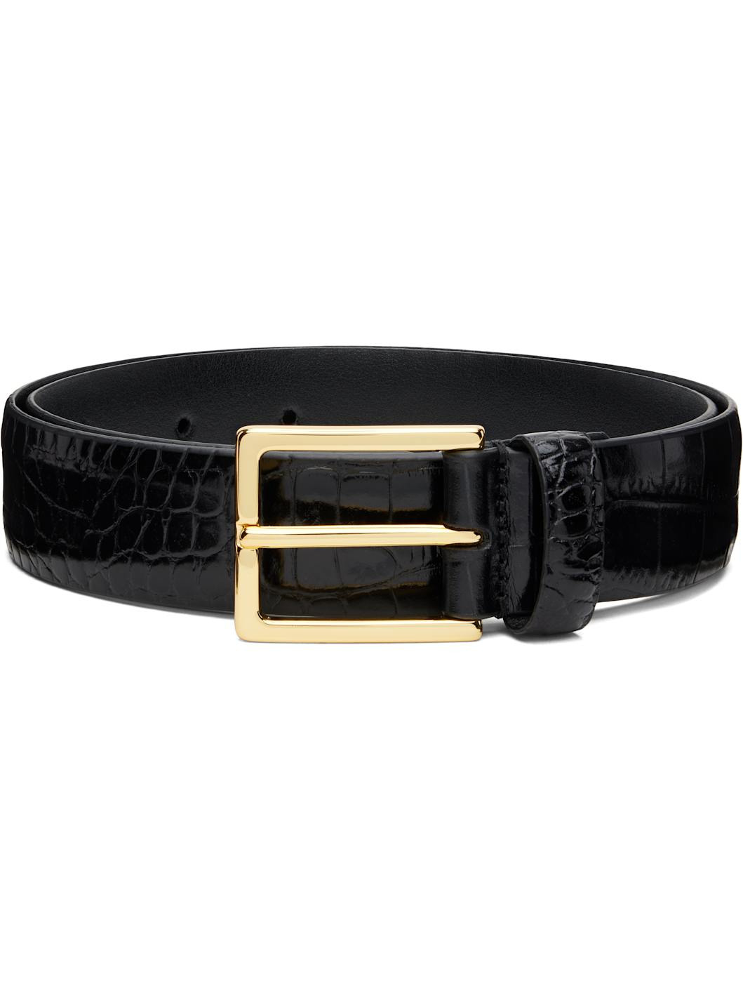 Croc-embossed patent calfskin belt. · Keeper loop · Pin-buckle fastening · Gold-tone hardware · W1" Supplier color: Black Calfskin. Made in Italy 252176F001021