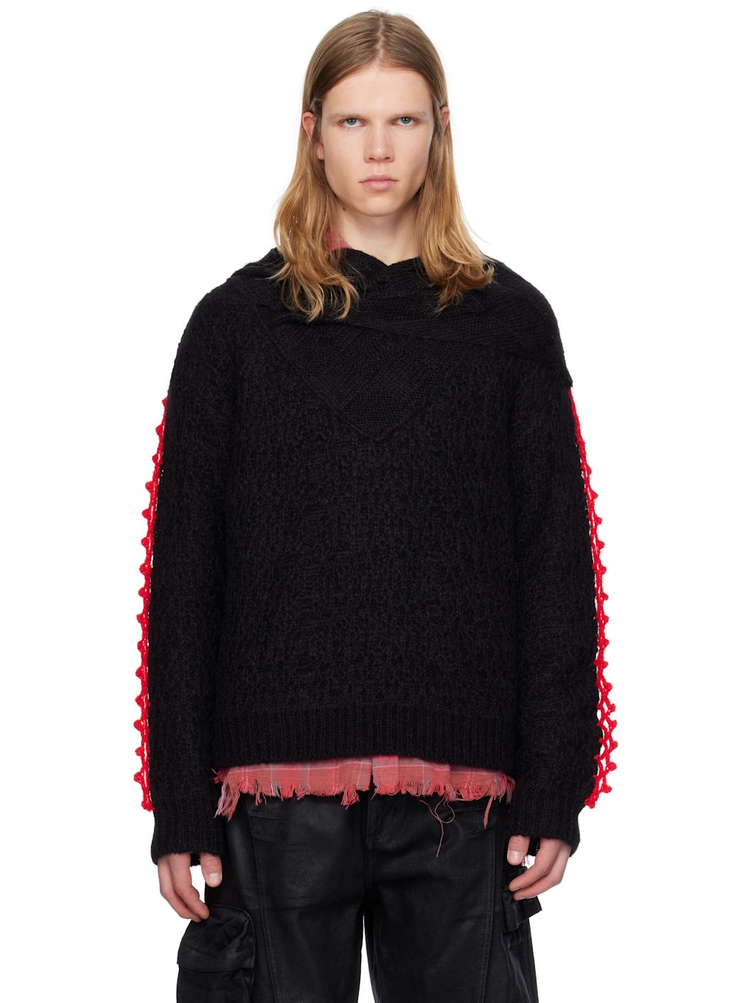 Oversized knit acrylic-blend sweater. Distressing throughout. · Shawl-style hood · Rib-knit hem and cuffs · Scalloped edge trim at sleeves and back Supplier color: Black 53% acrylic, 22% nylon, 18% wool, 7% alpaca. Made in South Korea 242375M202001