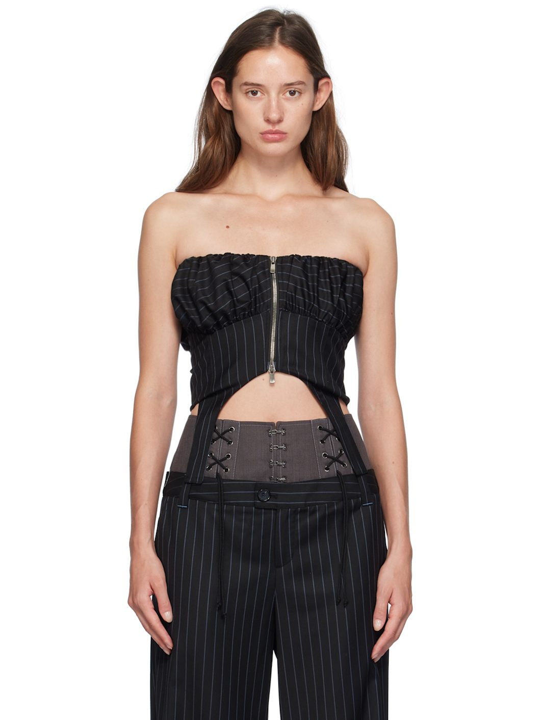 Wool- and silk-blend dobby cloth tank top. Pinstripes throughout. · Strapless construction · Elasticized straight neck · Gathering at bodice · Two-way zip closure · Garter-style straps at cropped hem · Full satin lining Supplier color: Black Body: 98% wool, 2% silk. Lining: 52% polyester, 48% viscose. Made in South Korea 242375F111004