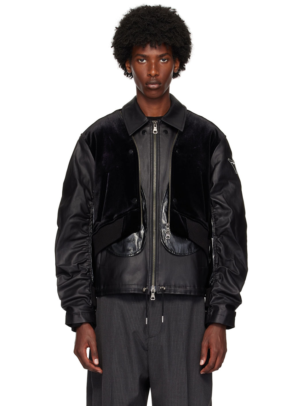 Insulated coated stretch cotton twill and coated stretch polyester lame jacket. Two-way zip closure and rib knit hem at integrated cotton-blend velvet vest-style overlay. · Layered and paneled construction · Pointed collar · Two-way zip closure · Welt pockets · Cord-lock drawstring at hem · Rubberized logo patch at sleeve · Ruching at sleeves · Pleats at partial rib knit cuffs · Logo-engraved rivets at back collar · Twin zip vents at back · Welt pocket at interior · Full quilted twill lining · Logo-engraved gunmetal-tone hardware Supplier color: Black Body 1: 98% cotton, 2% polyurethane. Body 2: 100% polyurethane. Body 3: 88% polyester, 12% polyurethane. Body 4: 74% cotton, 26% nylon. Body 5: 100% polyurethane. Trim: 49% acrylic, 47% wool, 3% nylon, 1% polyurethane. Fill: 100% polyester. Lining: 100% polyester. Made in South Korea 242375M180006