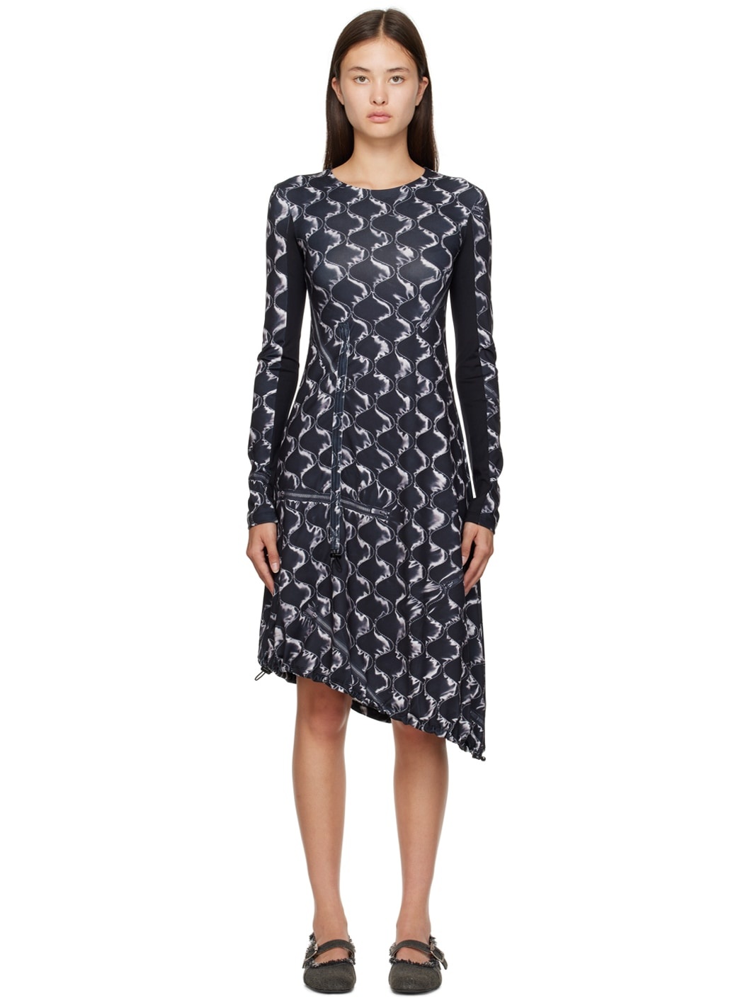 Stretch polyester jersey dress. Trompe l'œil graphic printed throughout. · Crewneck · Bungee-style drawstring at front and hem · Logo plaque at back collar · Unlined Supplier color: Black 91% polyester, 9% spandex. Made in South Korea 232375F054000