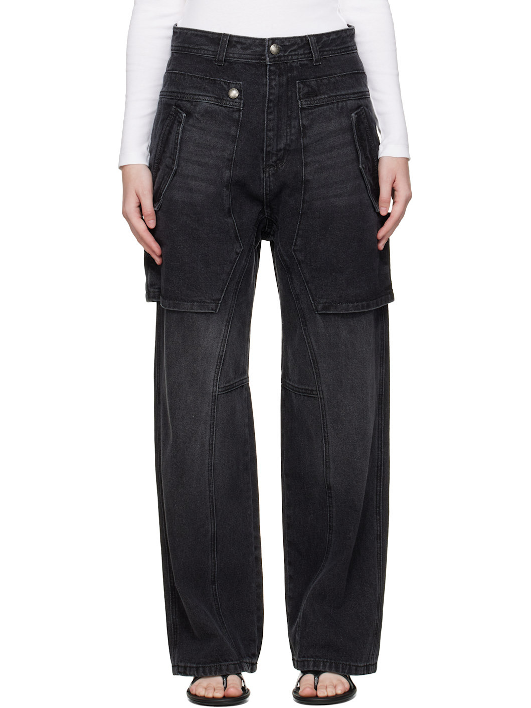 Non-stretch denim jeans. · Layered and paneled construction · Belt loops at waistband · Four-pocket styling · Zip fly · Cargo pockets and hammer loop at outseam · Leather logo patch at back waistband Supplier color: Washed black 100% cotton. Made in South Korea 252375F069000