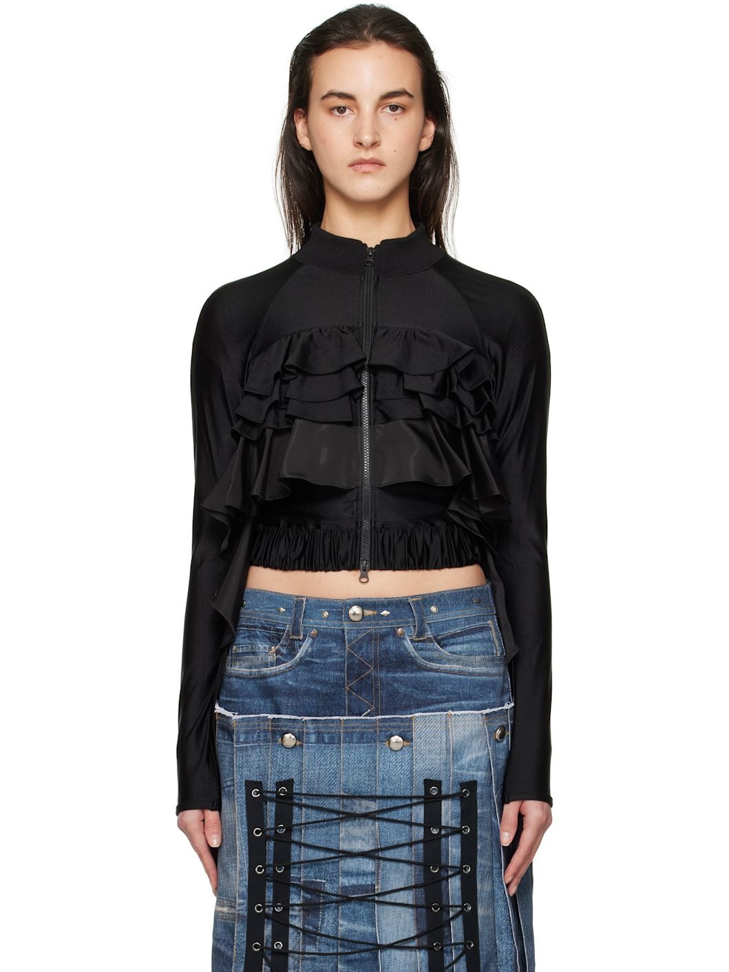 Stretch nylon satin jacket. · Rib-knit stand collar · Two-way zip closure · Tiered ruffles at front and back · Elasticized cropped hem · Raglan sleeves · Rubberized logo patch at back Supplier color: Black Body 1: 80% nylon, 20% polyurethane. Trim: 70% polyester, 28% cotton, 2% polyurethane. Body 2: 100% polyester. Made in South Korea 242375F063001