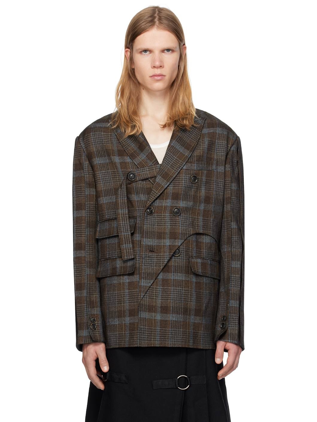 Wool-blend twill blazer. Check pattern throughout. · Paneled construction · Peaked lapel · Double-breasted button closure · Welt pocket · Flap pockets · Pleats at sleeves · Two-button surgeon's cuffs · Logo-engraved rivets at back collar · Twin vents at back hem · Welt pocket and button-tab at interior · Full satin lining Supplier color: Brown