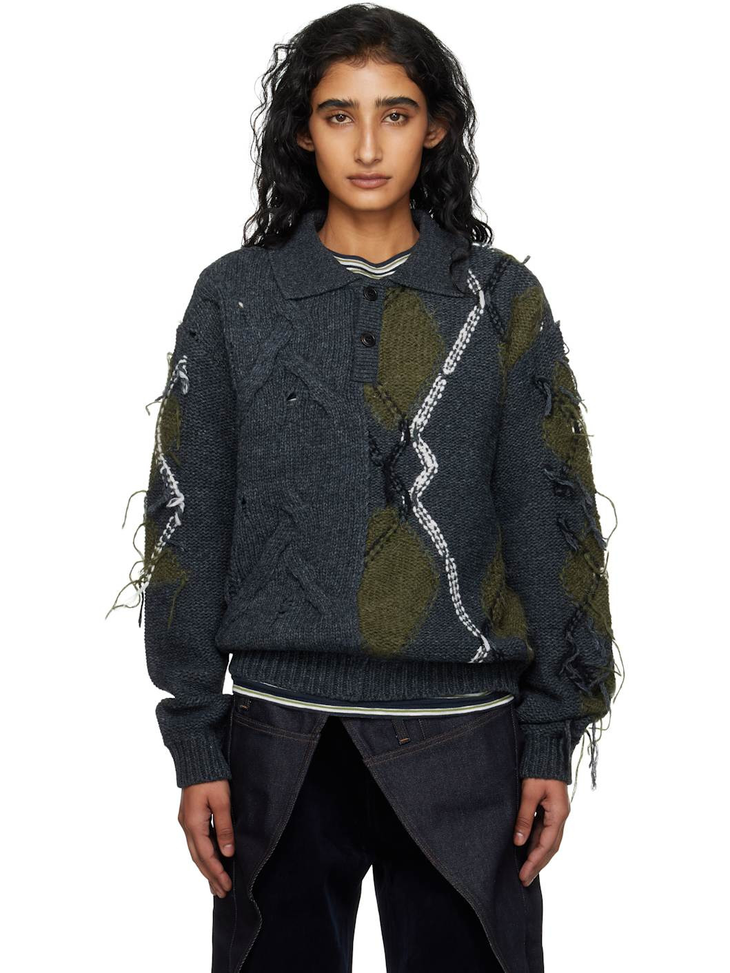 Cable-knit wool-blend polo. · Fil-coupe and intarsia argyle pattern throughout · Rib-knit spread collar, hem, and cuffs · Two-button placket Supplier color: Charcoal Body: 76% wool, 24% nylon. Trim: 56% mohair, 44% acrylic. Made in South Korea 252375F100000