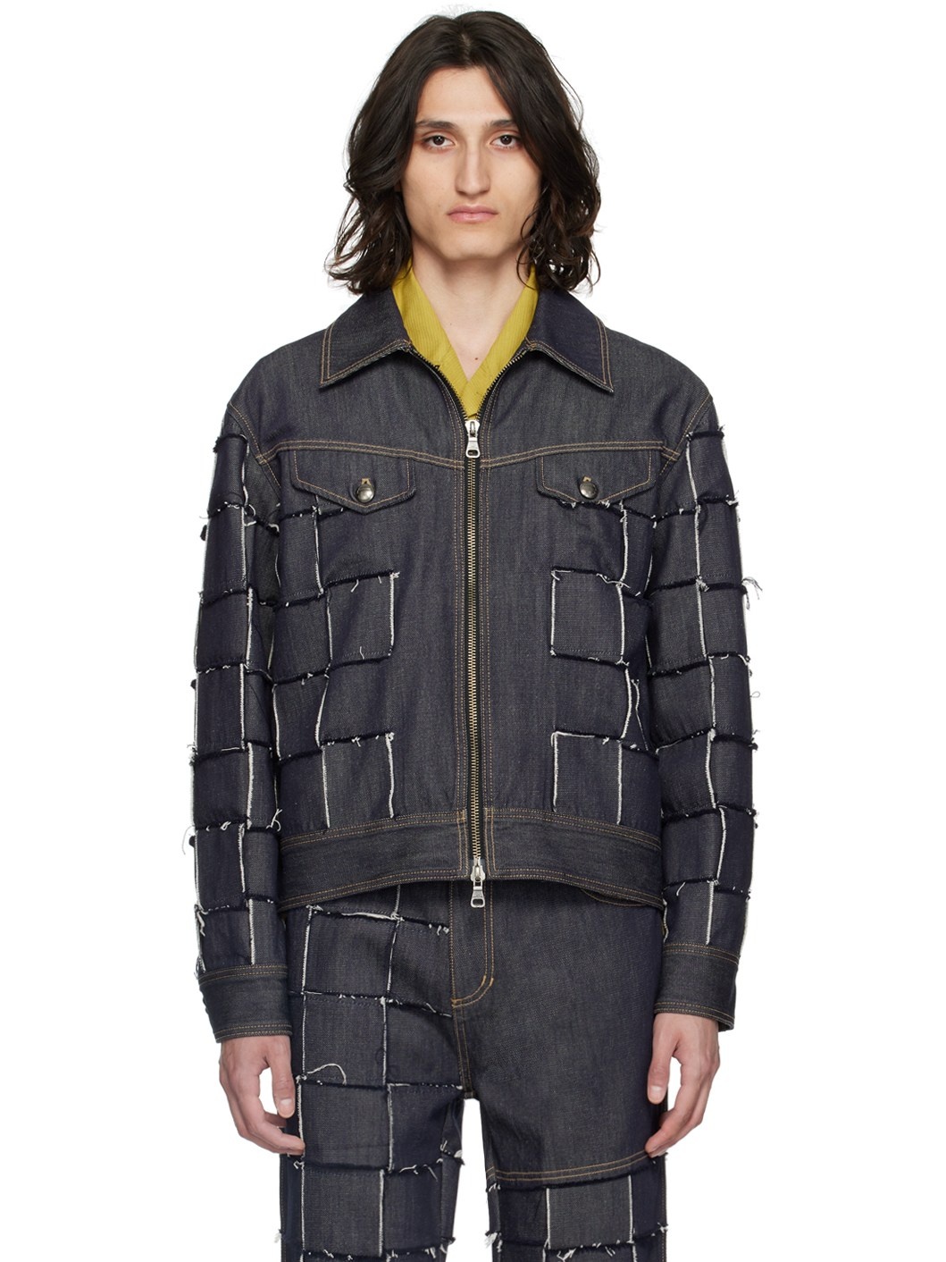 12 oz non-stretch denim jacket. Frayed edges throughout. · Paneled construction · Spread collar · Two-way zip closure · Flap pockets · Dropped shoulders · Adjustable single-button barrel cuffs · Leather logo patch at back hem · Logo-engraved antiqued silver-tone hardware · Contrast stitching in tan Supplier color: Indigo 43% polyester, 41% cotton, 16% rayon. Made in South Korea 241375M177002