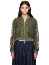 Semi-sheer cotton- and nylon-blend mesh bomber jacket. Logo and floral pattern embroidered throughout. · Rib-knit stand collar, hem, and cuffs · Nylon twill trim and zip detailing at collar and placket · Two-way zip closure · Welt pockets · Cropped hem · Logo patch at back collar · Partial mesh lining Supplier color: Brown Body: 51% cotton, 40% nylon, 9% lyocell. Trim 1: 100% nylon. Trim 2: 98% polyester, 2% elastane. Lining: 68% polyester, 32% cotton. Made in South Korea 251375F058000