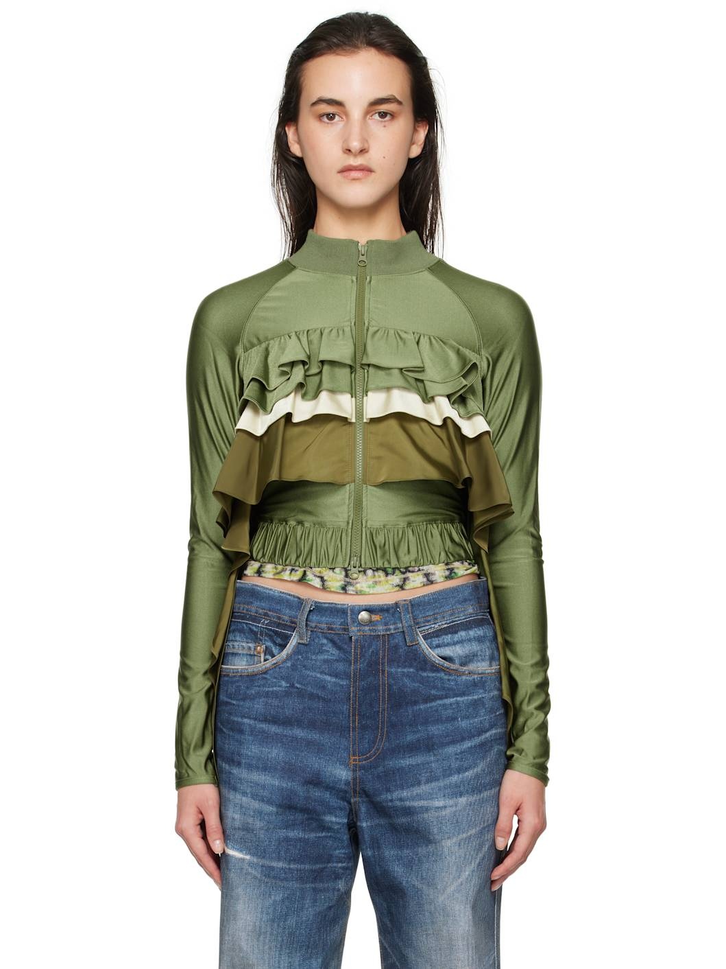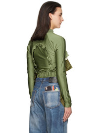 Stretch nylon satin jacket. · Rib-knit stand collar · Two-way zip closure · Tiered ruffles at front and back · Elasticized cropped hem · Raglan sleeves · Rubberized logo patch at back Supplier color: Khaki Body 1: 80% nylon, 20% polyurethane. Body 2: 100% polyester. Trim: 70% polyester, 28% cotton, 2% polyurethane. Made in South Korea 242375F063000