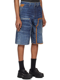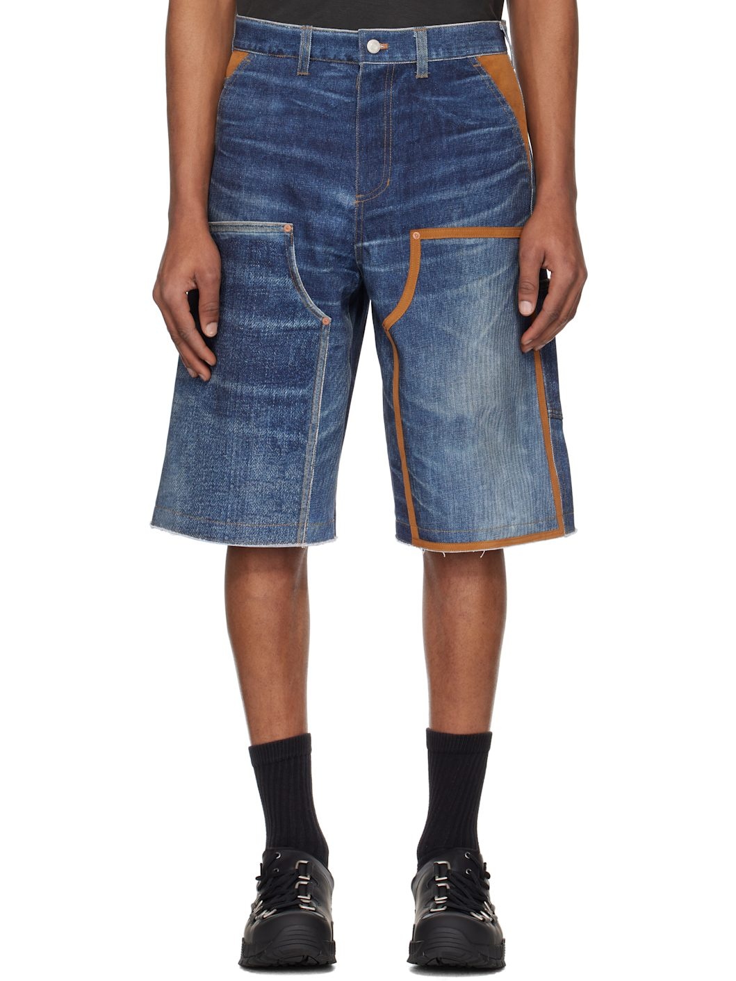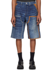 Non-stretch denim shorts. Fading, whiskering, and faux-suede trim throughout. - Paneled construction - Belt loops - Five-pocket styling - Zip fly - Raw edge at cuffs - Patch pockets at outseam - Patch pocket and hammer loop at outseam - Leather logo patch at back waistband and pocket - Logo-engraved silver-tone and copper-tone hardware - Contrast stitching in tan Supplier color: Blue