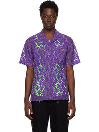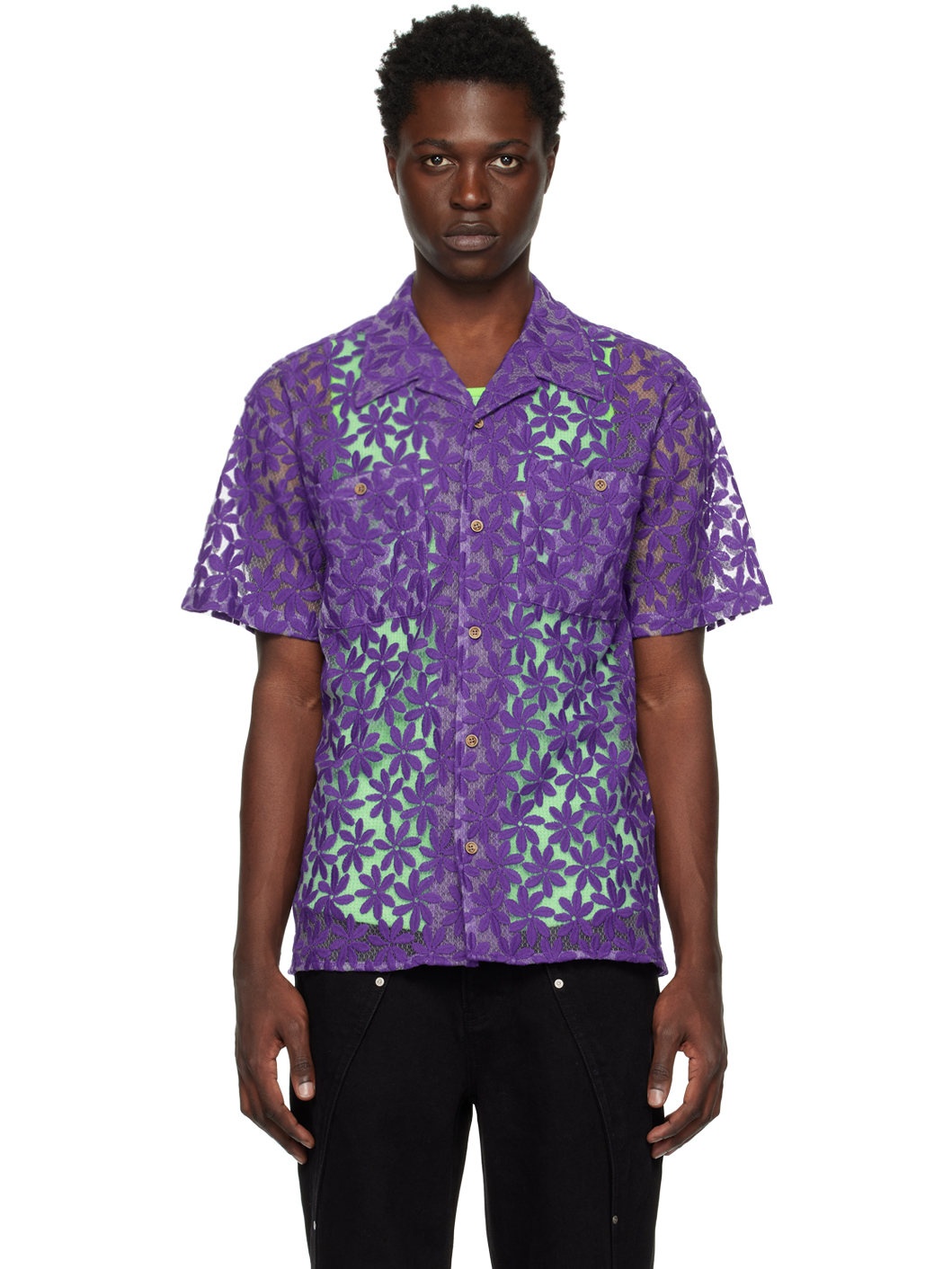 Semi-sheer nylon mesh shirt. Floral pattern embroidered throughout. · Open spread collar · Button closure · Patch pockets Supplier color: Lilac 100% polyamide. Made in South Korea 231375M192023