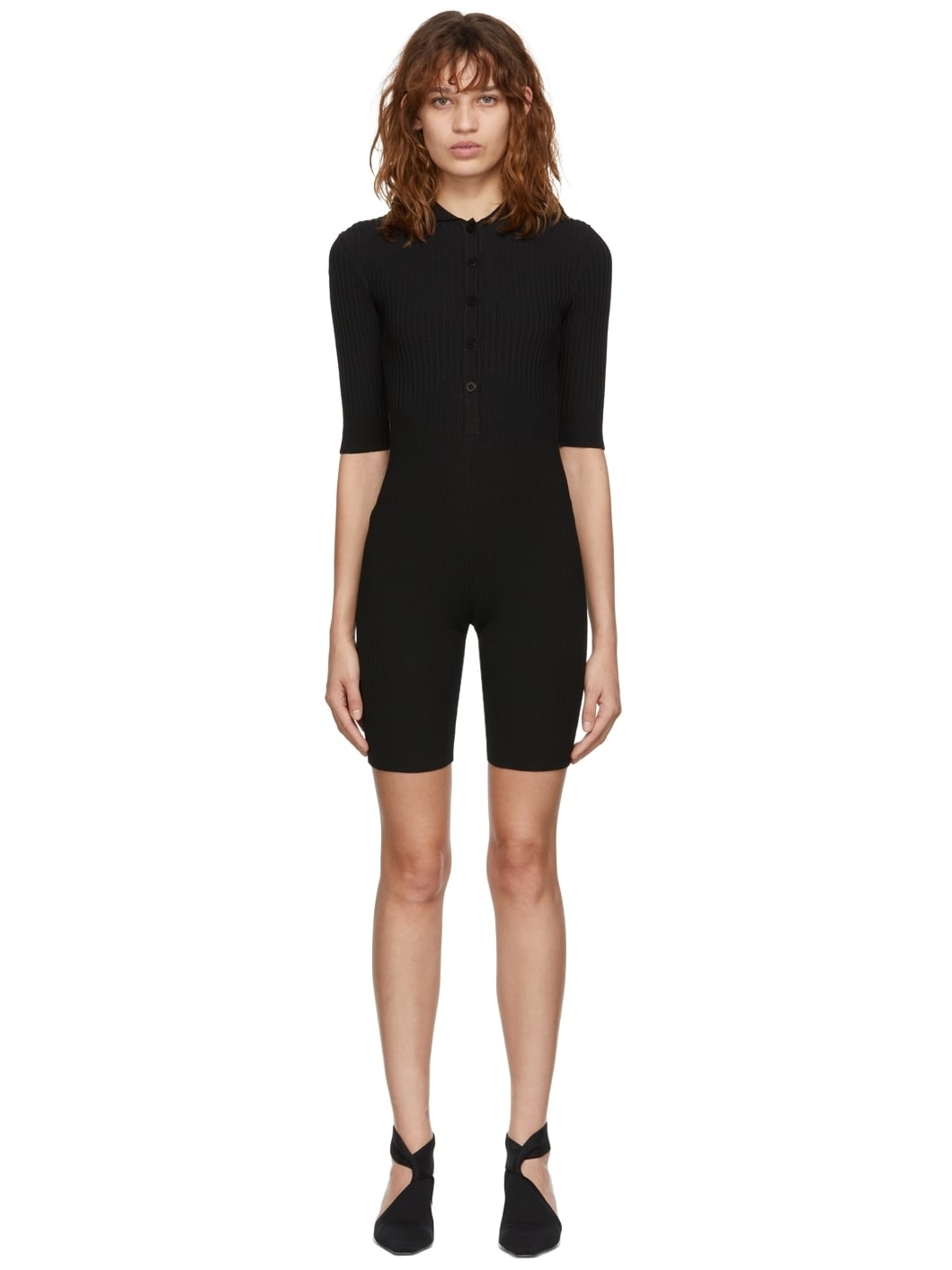 Half-sleeve rib knit stretch viscose-blend jumpsuit in black. · Spread collar · Button closure Supplier color: Black 80% viscose, 10% polyester, 9% polyamide, 1% elastane. Made in Italy 221753F070002