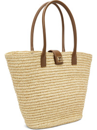 Handcrafted woven cellulose tote. · Buffed leather trim throughout · Fixed twin rolled shoulder straps · Logo hardware at magnetic press-stud tab closure · Unlined · Gold-tone hardware · H12.5" x W19.5" x D4.5" Supplier color: Natural/Cognac Textile, leather. Made in Turkey 252092F046002