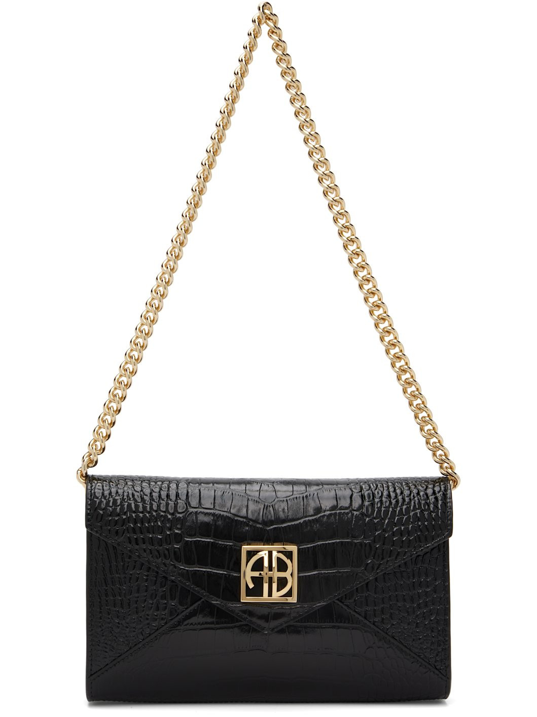 Croc-embossed patent leather clutch. · Detachable curb chain shoulder strap · Logo hardware at magnetic press-stud flap · Card slot at interior · Buffed leather lining · Gold-tone hardware · H6" x W9 x D1.75" Supplier color: Black embossed Leather. Made in Turkey 252092F048005