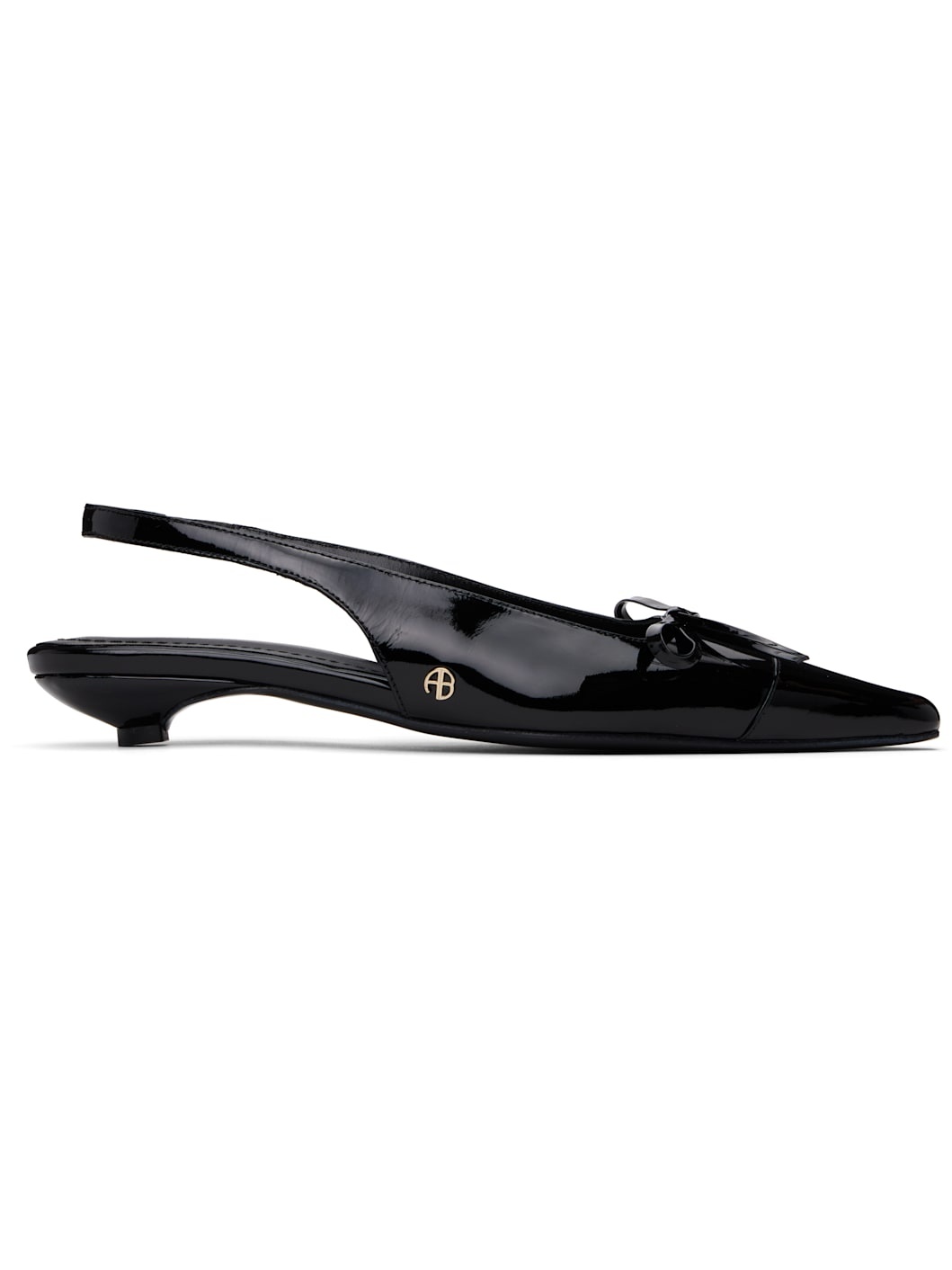 Patent leather heels in black. · Pointed toe · Bow applique at vamp · Partially elasticized slingback strap · Logo hardware at outer side · Buffed leather lining · Logo stamp at padded footbed · Covered kitten heel with rubber injection · Polished leather sole · Gold-tone hardware · Heel: H1" Supplier color: Black patent Upper: leather. Sole: leather, rubber. Made in Turkey 251092F122003