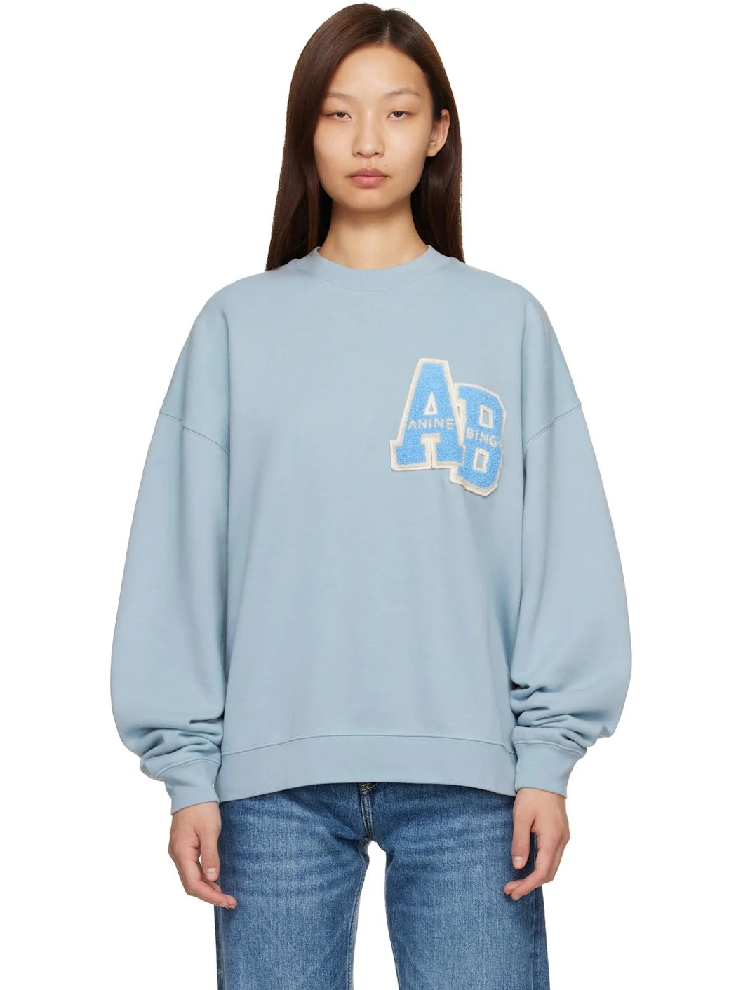 Oversized cotton fleece sweatshirt. · Rib-knit crewneck, hem, and cuffs · Chenille logo patch at chest · Dropped shoulders Supplier color: Pastel blue 100% cotton. Made in Turkey 261092F098011