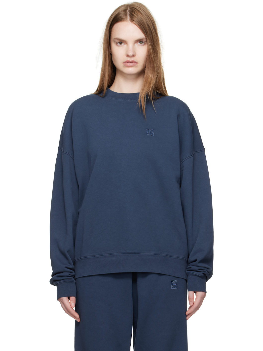 French terry sweatshirt. · Rib-knit crewneck, hem, and cuffs · Logo embroidered at chest · Dropped shoulders · Bonded logo at back collar Supplier color: Washed navy 100% cotton. Made in Turkey 252092F098003