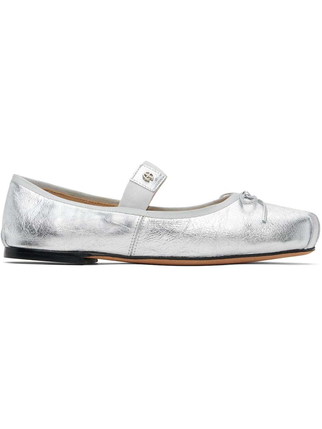 Crinkled leather Mary Jane-style ballerina flats in metallic silver tone. · Bow accent at vamp · Grosgrain trim at collar · Logo hardware at elasticized strap · Logo stamp at padded leather footbed · Suede and grained leather lining · Stacked leather heel with rubber injection · Nubuck sole Supplier color: Silver Upper: leather. Sole: leather, rubber. Made in Portugal 251092F118000