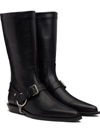 Mid-calf buffed nappa leather boots. · Pointed toe · Harness-style pin-buckle strap · Rivet at heel collar · Zip closure at inner side · Buffed leather lining · Stacked leather block heel with rubber injection · Curb chain detailing at sole · Polished leather sole Supplier color: Black Leather. Made in Italy 251378M228000