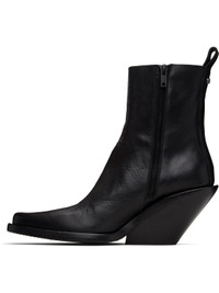 Ankle-high grained calfskin boots. · Pointed square toe · Zip closure at inner side · Pull-loop at heel collar · Buffed leather lining · Stacked leather heel with rubber injection · Leather sole · Heel: H3" Supplier color: Black Upper: calfskin. Sole: leather, rubber. Made in Italy 252378F113001