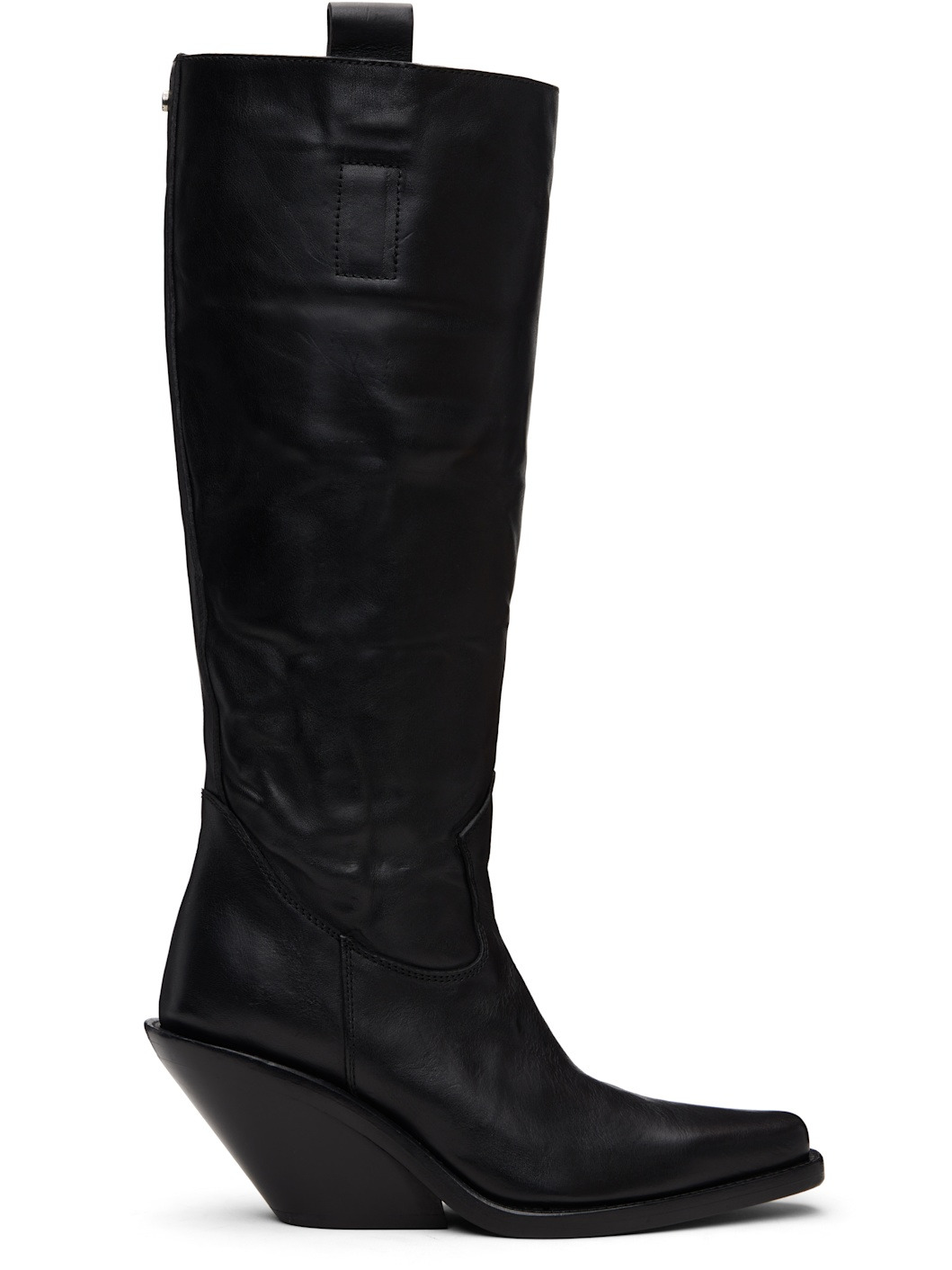 Knee-high washed and grained calfskin boots. · Pointed square toe · Rivet and pull-loops at collar · Zip closure at inner side · Stacked leather midsole and block heel · Suede sole with rubber injection · Heel: H3.5" Supplier color: Black Upper: calfskin. Sole: leather, rubber. Made in Italy 252378F114000