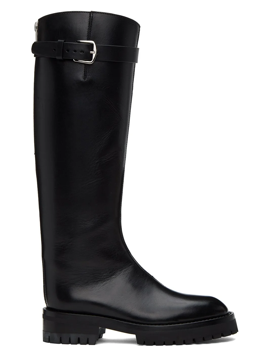 Knee-high buffed calfskin boots in black. · Detachable pin-buckle strap at collar · Zip closure at heel · Grained leather lining · Treaded foam rubber sole · Heel: H:1.5 in Supplier color: Black