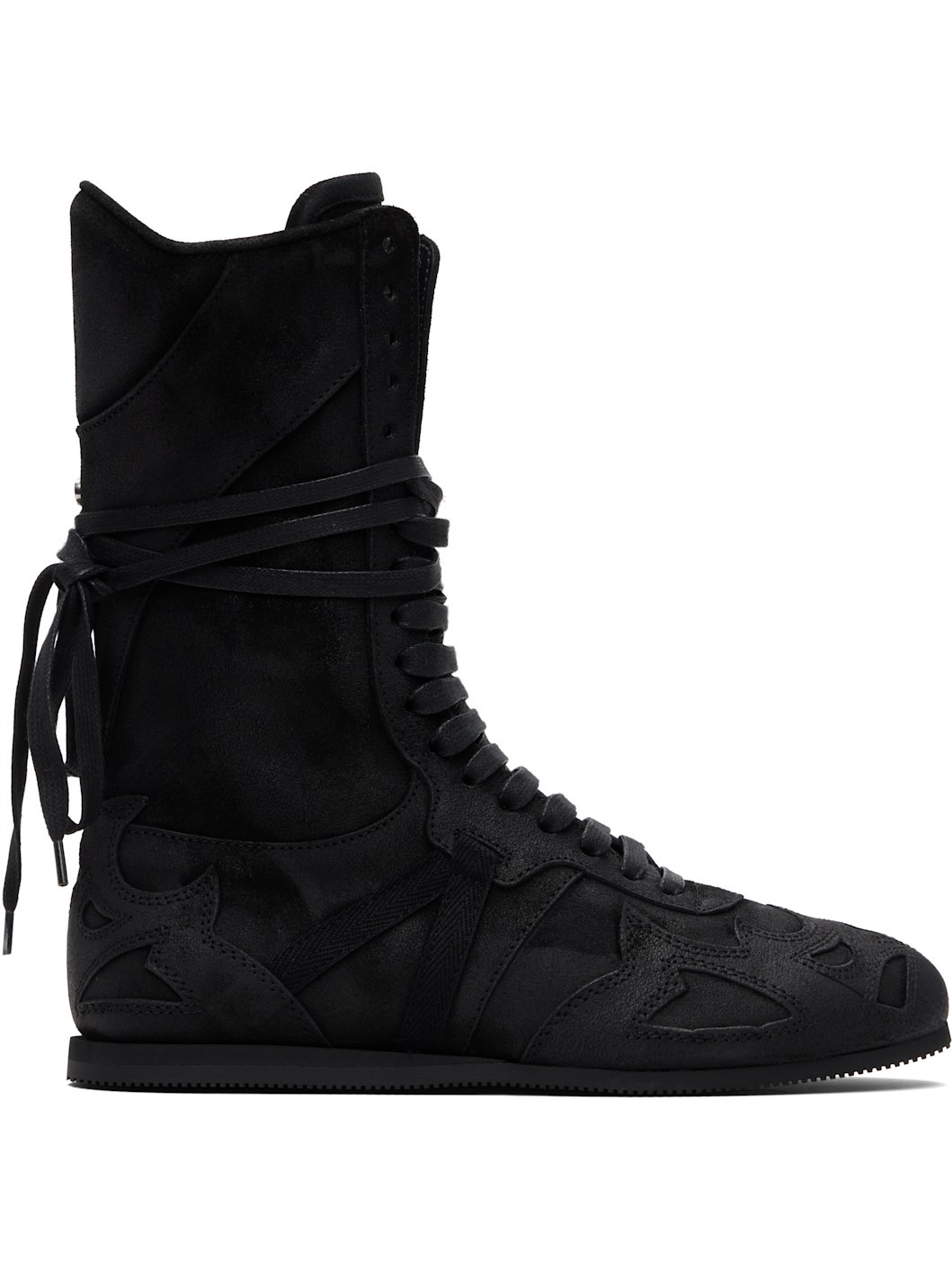 Mid-calf paneled and blistered calfskin sneakers. · Wraparound lace-up closure · Grosgrain trim at sides · Zip closure at inner side · Rivet at back · Treaded rubber sole Supplier color: Black Upper: calfskin. Sole: rubber. Made in Italy 252378M236000