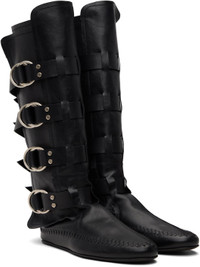 Knee-high buffed nappa leather boots. · Blanket stitching throughout · Extended tongue · Cinch straps at inner side · Leather sole with rubber injection · Antiqued silver-tone hardware Supplier color: Black Leather. Made in Italy 251378M228002