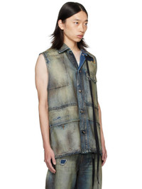 Sleeveless non-stretch denim jacket. · Discoloration, distressing, and sprayed dye throughout · Topstitched patches throughout · Spread collar · Detachable ribbon with logo plaque at collar · Button closure · Flap pockets at chest and back waist · Buttoned patch pockets at waist · Contrast stitching in brown Supplier color: Vintage blue 100% cotton. Made in Italy 252378M177002