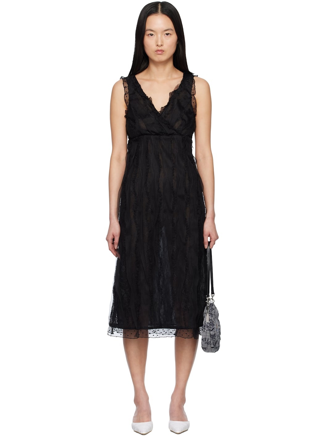 Semi-sheer polyester-blend lace midi dress. Gathering, ruffles, jacquard polka dots, and floral pattern throughout. · Slim-fit · V-neck · Concealed zip closure at side seam · Full crepe lining Supplier color: Black Body: 68% polyester, 32% nylon. Trim: 100% nylon. Lining: 100% polyester. Made in United States 251894F054000